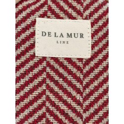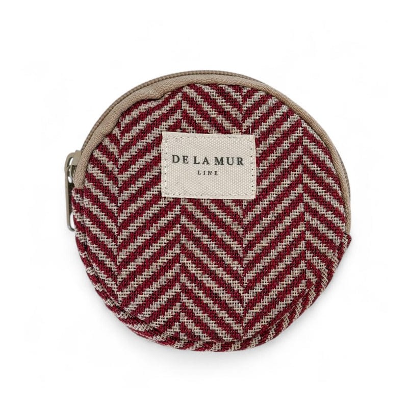 Monedero redondo con cremallera en la parte superior y pequeña asa de cordón de color beige en el lateral. Con tejido grueso de jacquard con estampado tipo espiga de color granate. Cada articulo puede tener una variación en el estampado, dependiendo de donde se haya efectuado el corte de la pieza. Forrado de tejido grueso de color gris en la parte interior. Para su correcto mantenimiento se aconseja lavarlo en frío a mano y no utilizar secadora.