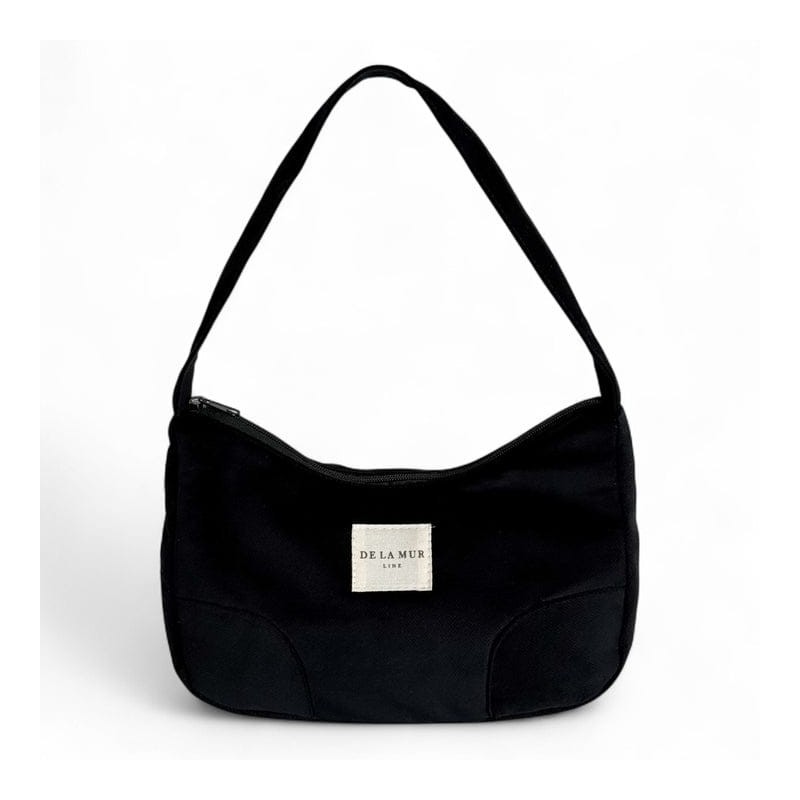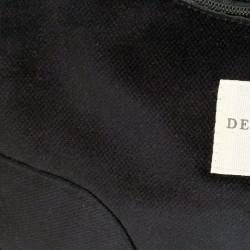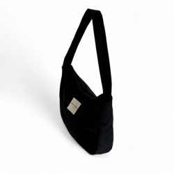 Bolso pequeño para llevar al hombro con asa de tejido. Cierre superior con cremallera. Con tejido grueso de terciopelo de color negro. Forrado de tejido grueso de color gris en la parte interior. Bolsillo interior con cremallera. Para su correcto mantenimiento se aconseja lavarlo en frío a mano y no utilizar secadora.