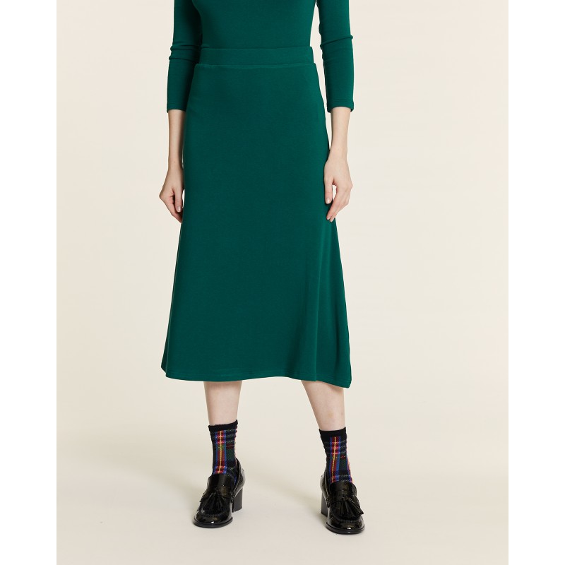 Falda midi evassé verde, por debajo de la rodilla, con cinturilla elástica.