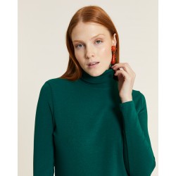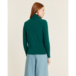 Top punto cuello cisne verde, mangas largas rectas, a la altura de la cintura.