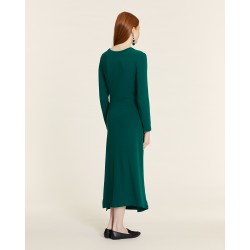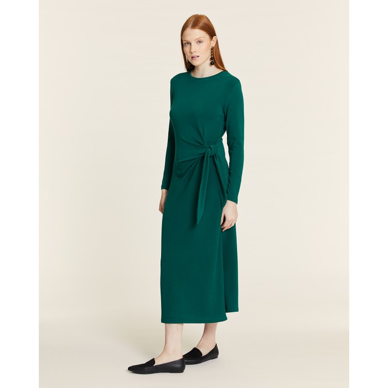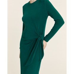 Vestido anudado de punto verde, mangas largas rectas, escote redondo, por encima del tobillo con raja lateral.