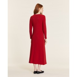 Vestido midi de punto rojo, mangas largas rectas, escote redondo, por encima del tobillo.