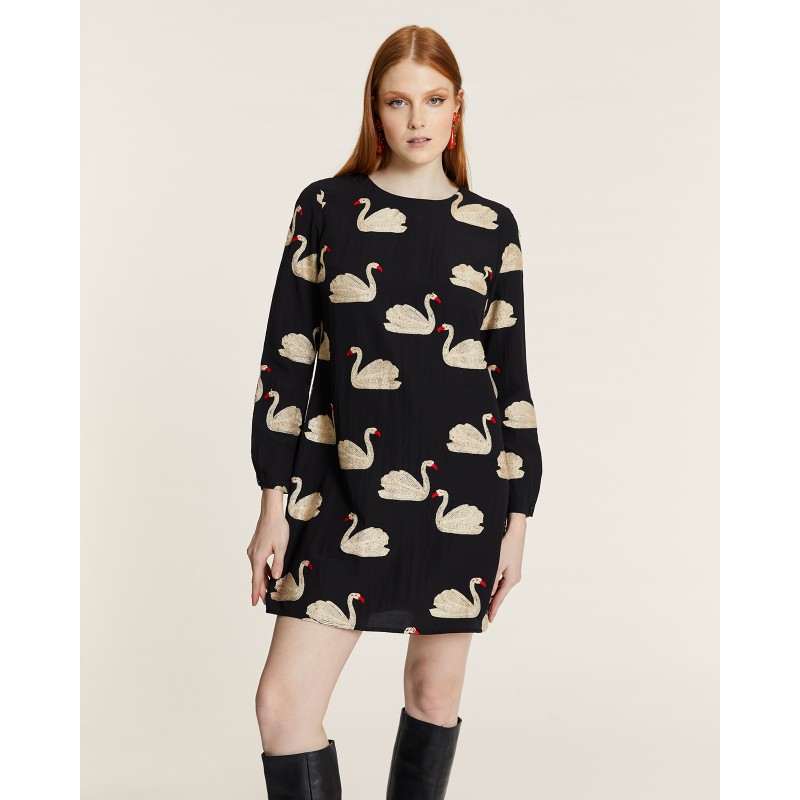 Vestido corto bordado cisnes, mangas largas rectas con puño abotonado, por debajo de la cadera.