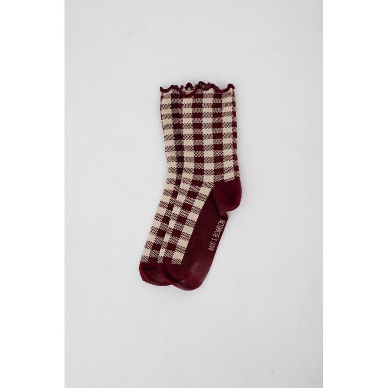 Calcetines vichy de media caña con acabado fruncido en la parte superior. Puntera, suela y talón en color liso a contraste. Con el logo de Mus&Bombon en la base. Combina con Marlene, Marylebone y Malsaña.