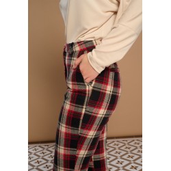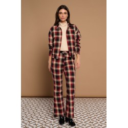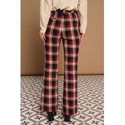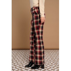 Pantalón de vestir acampanado y de tiro alto. Cierre de botón y cremallera. Estampado tartán. Bolsillos de doble vivo.