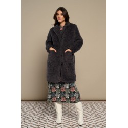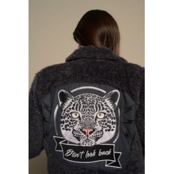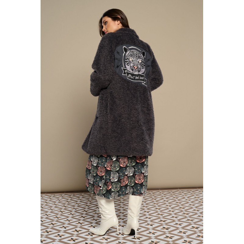 Abrigo de borreguillo largo de cuello solapa y manga larga. Bolsillo laterales. Cierre con botones frontales. Detalle guepardo y "don´t look back" bordado en espalda.