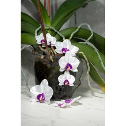 Los Phalaenopsis Gemina Blanca reinterpretan la dualidad de la orquídea —su fragilidad aparente y su fuerza interior— en una pieza ligera y etérea.