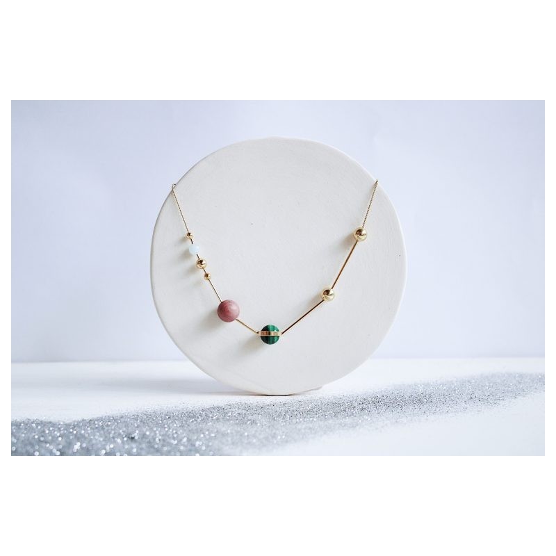 Los planetas están ordenados según su distancia respecto al Sol, combinando esferas de malaquita, aguamarina, rodonita mate y latón.