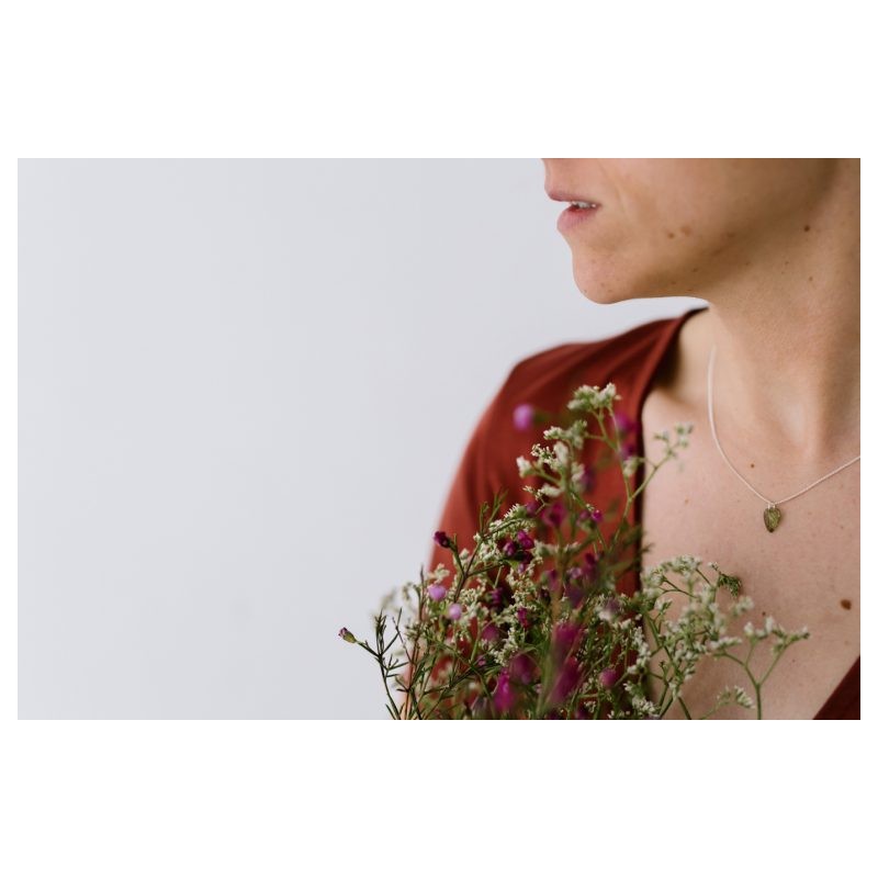 Una pieza sencilla y delicada. Cada hojita va acompañada de una fina cadenita de 42cm de largo, de Latón chapado en oro 18kt (hojas nº 1 a 60) o de Plata 925 (hojas nº 61 a 85), ambas libres de tóxicos como el níquel y el plomo.