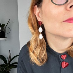 Son unos pendientes con una base de latón pulida a mano (una a una) y palillo de plata, pensados para ser cómodos y duraderos. Del corazón cuelgan dos lágrimas impresas en 3D en blanco nácar, con un movimiento suave y una luz discreta que se nota cuando te mueves. Minimalistas, delicados y con intención: para celebrar a tu amiga, a tu hermana de vida… o a ti misma.