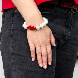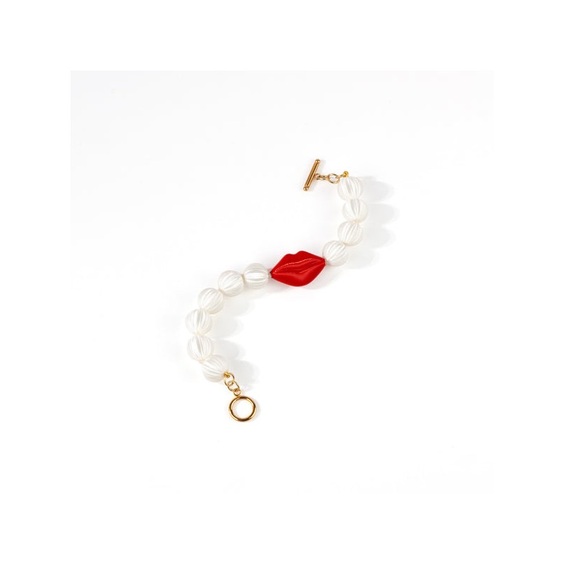 Está formada por perlitas impresas en 3D en blanco nácar con textura, ligeras y muy cómodas. Y en el centro (porque la tribu también necesita su punto divertido) aparece el detalle protagonista: unos labios rojos que le dan color y actitud sin perder la elegancia. Se cierra con un cierre tipo T en tono dorado, fácil de poner y quitar y pensado para llevarla a diario.