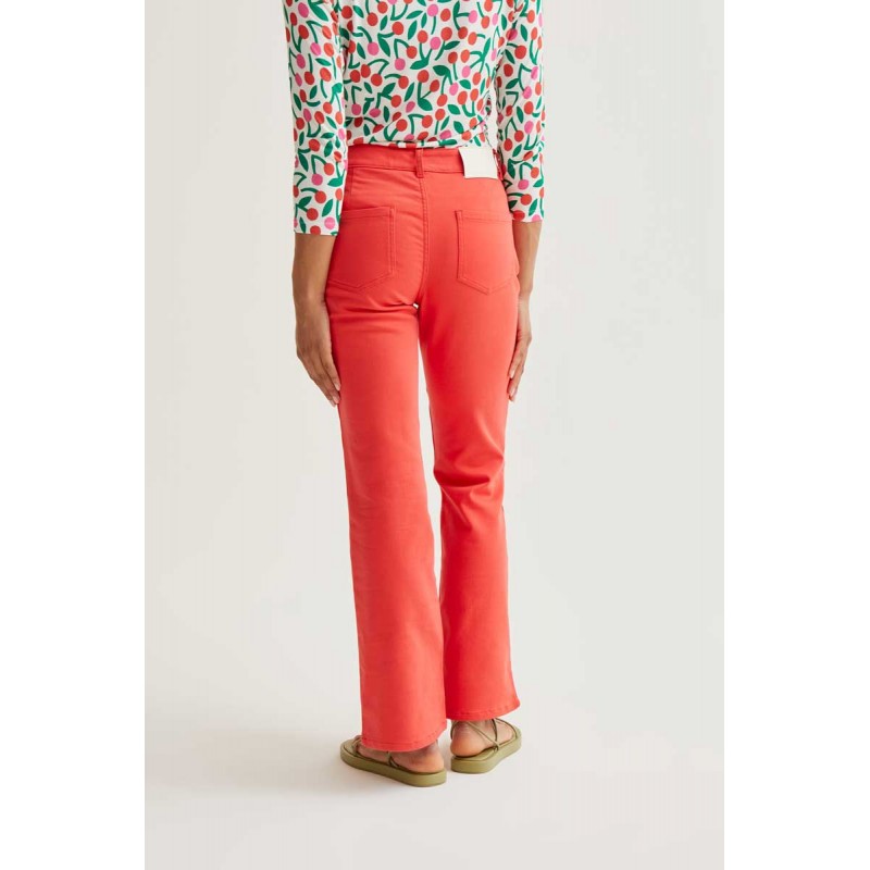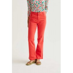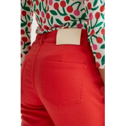 Pantalón de tejido denim de color rojo. Cintura fija de tiro alto y pernera recta. Cierre frontal con cremallera y botones. Bolsillos laterales y posteriores. La modelo mide 173 cm y lleva la talla S.