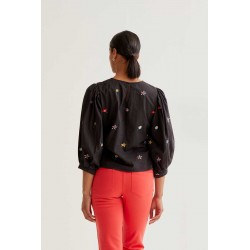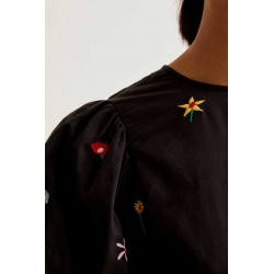 Top con estampado black gardener flowers. Cuello redondo y manga ligeramente abullonada. Cierre posterior con botón oculto. La modelo mide 173 cm y lleva la talla S.