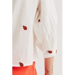 Camisa de tejido 100% algodón de color blanco con estamado ladybugs. Cuello redondo y manga larga ligeramente abullonada. Cierre frontal con botones de color blanco. LA modelo mide 177 cm y lleva la talla S.