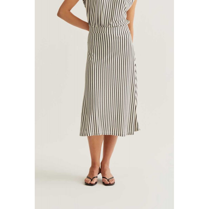 Falda midi de tejido jersey viscoso con estampado de rayas de color negro. Cintura fija elástica de tiro alto. Corte fluido. La modelo mide 177 cm y lleva la talla S.