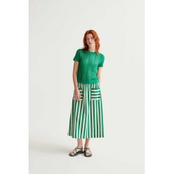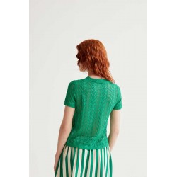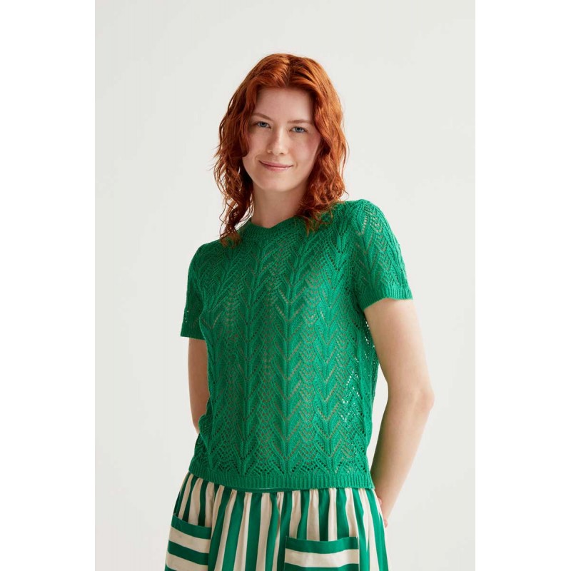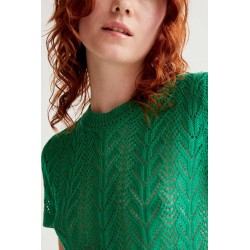 Top con tejido de punto calado en forma de flor de color verde. Cuello redondo y sin mangas. Detalles acabados en rib. La modelo mide 175 cm y lleva la talla S.