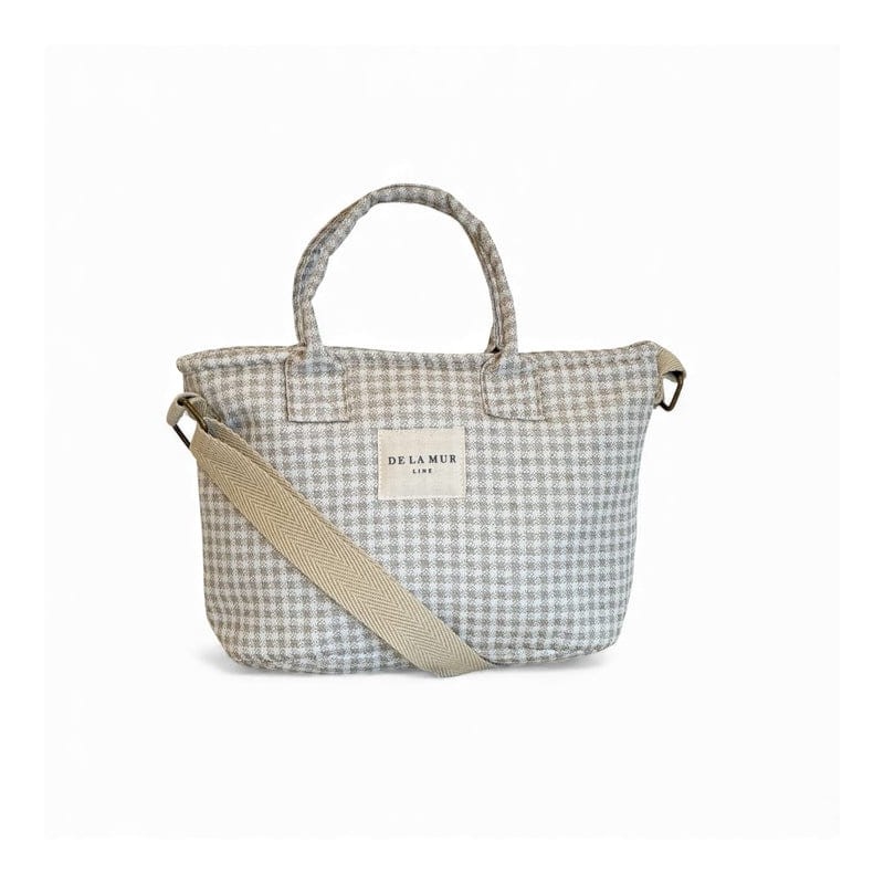 Bolso capazo con asas pequeñas de tela en la parte superior y asa larga ajustable de espiga de algodón de color beige. Con un tejido grueso de jacquard 80% algodón y 20% poliéster con estampado a cuadros vichy en tono beige y crudo. Cierre superior con cremallera. Forrado con tejido grueso de color gris oscuro y acolchado en la parte interior. Bolsillo interior con cremallera. Opción de llevarlo en la mano o como bandolera.