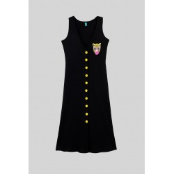 Vestido entallado sin mangas, escote en V y botonadura central.