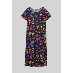 Vestido camiseta en tul elástico fluido. Cuello redondo, manga corta y bajo acabado en aberturas laterales. Diseñado con un vestido interior lencero de tejido elástico. - 95% Poliéster y 5% Elastán. - Lavar a máquina en agua fría. No usar blanqueador. No usar secadora. Secar colgado a la sombra. Planchado a temperatura baja, por debajo de 100 ºC. Planchar del revés. No dejar la plancha parada sobre la prenda. Lavar con colores similares.