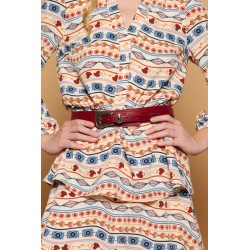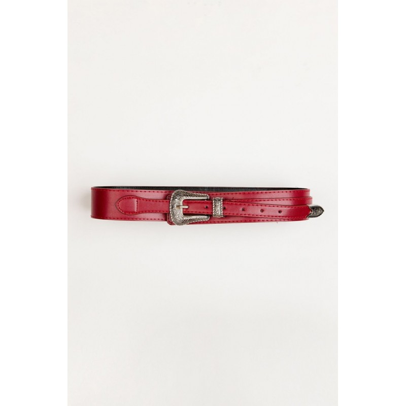 Cinturón con hebilla metálica grabada.