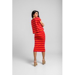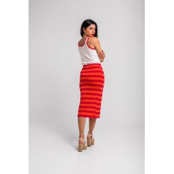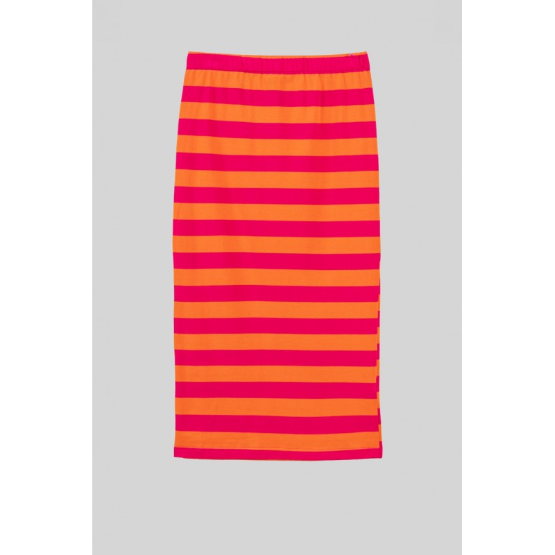 Falda tubo midi elástica de rayas rosas y naranjas.