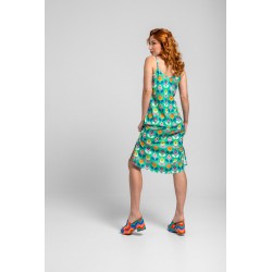 Vestido lencero midi de tejido fluido de estampado vectorial. Escote pico en pecho y espalda y tirantes finos ajustables. Detalle de aberturas en los laterales. - 100% Poliéster. - Lavar a máquina en agua fría. No usar blanqueador. No usar secadora. Secar colgado a la sombra. Planchado a temperatura baja, por debajo de 100 ºC. Planchar del revés. No dejar la plancha parada sobre la prenda. Lavar con colores similares.