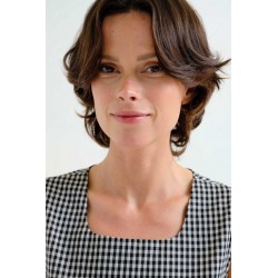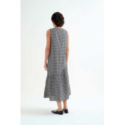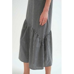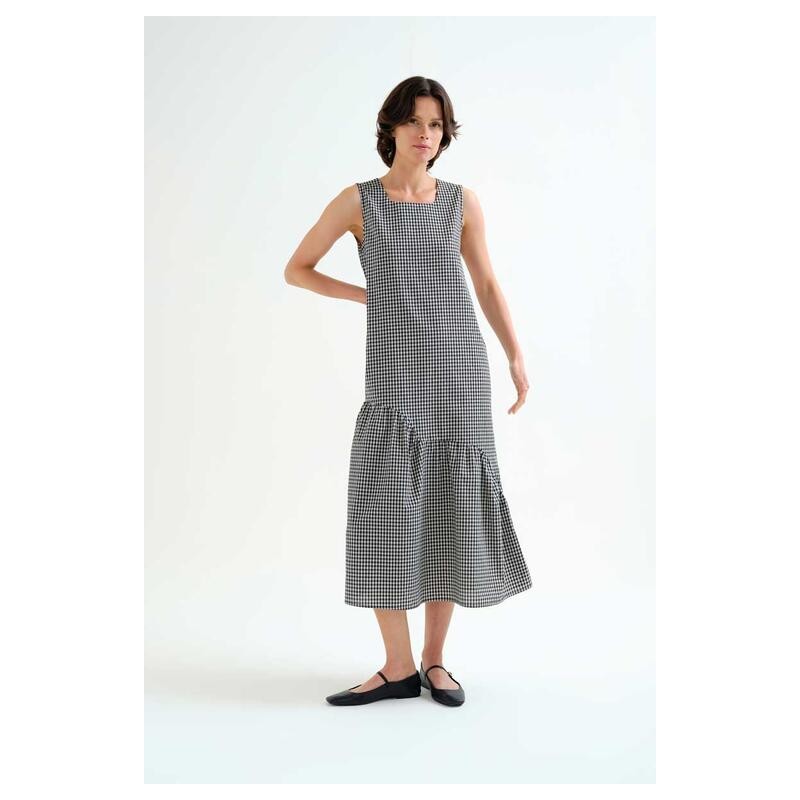 Vestido de tejido 80% algodón vichy de color negro. Escote cuadrado y tiranes gruesos. Corte asimétrico. La modelo mide 177 cm y lleva la talla S.