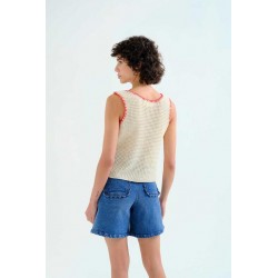 Top de tejido punto calado de color blanco roto.