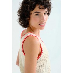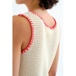 Top de tejido punto calado de color blanco roto. Cuello redondo y tirantes gruesos con detalles bordados en rojo. La modelo mide 175 cm y lleva la talla S.