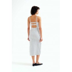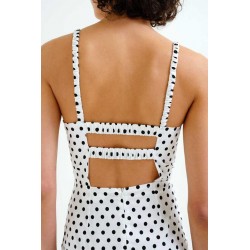 Vestido midi de tejido 95% algodón con estampado de puntos negros. Escote recto y tirantes. Abertura lateral. Cierre posterior con cremallera oculta. La modelo mide 175 cm y lleva la talla S.